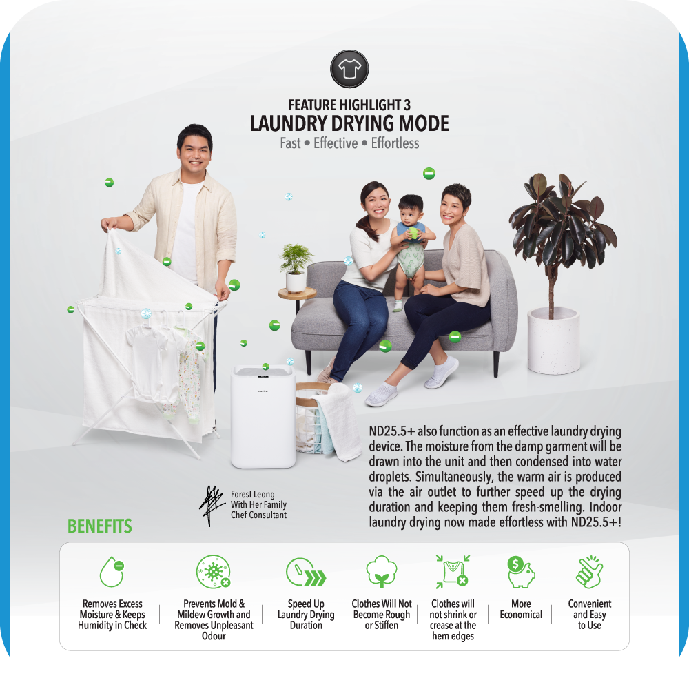 ND25.5+ also function as an effective laundry drying device. The moisture from the damp garment will be drawn into the unit and then condensed into water droplets. Simultaneously, the warm air is produced via the air outlet to further speed up the drying duration and keeping them fresh-smelling. Indoor laundry drying now made effortless with ND25.5+!